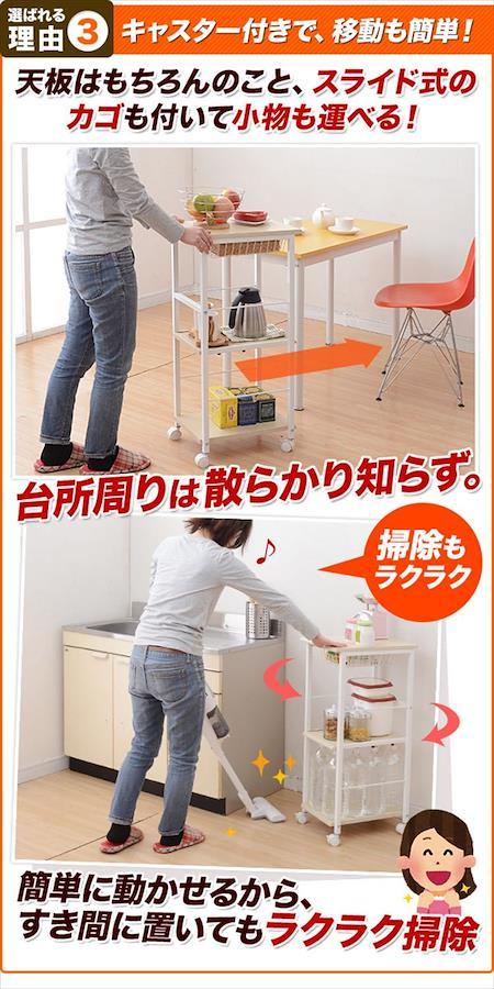 商品紹介幅が30cmのスリムタイプのキッチンワゴンです。スリムなので狭いキッチンや隙間収納に最適です。料理の作業台としても活躍してくれます。キャスター付きなので移動できるのも便利です。