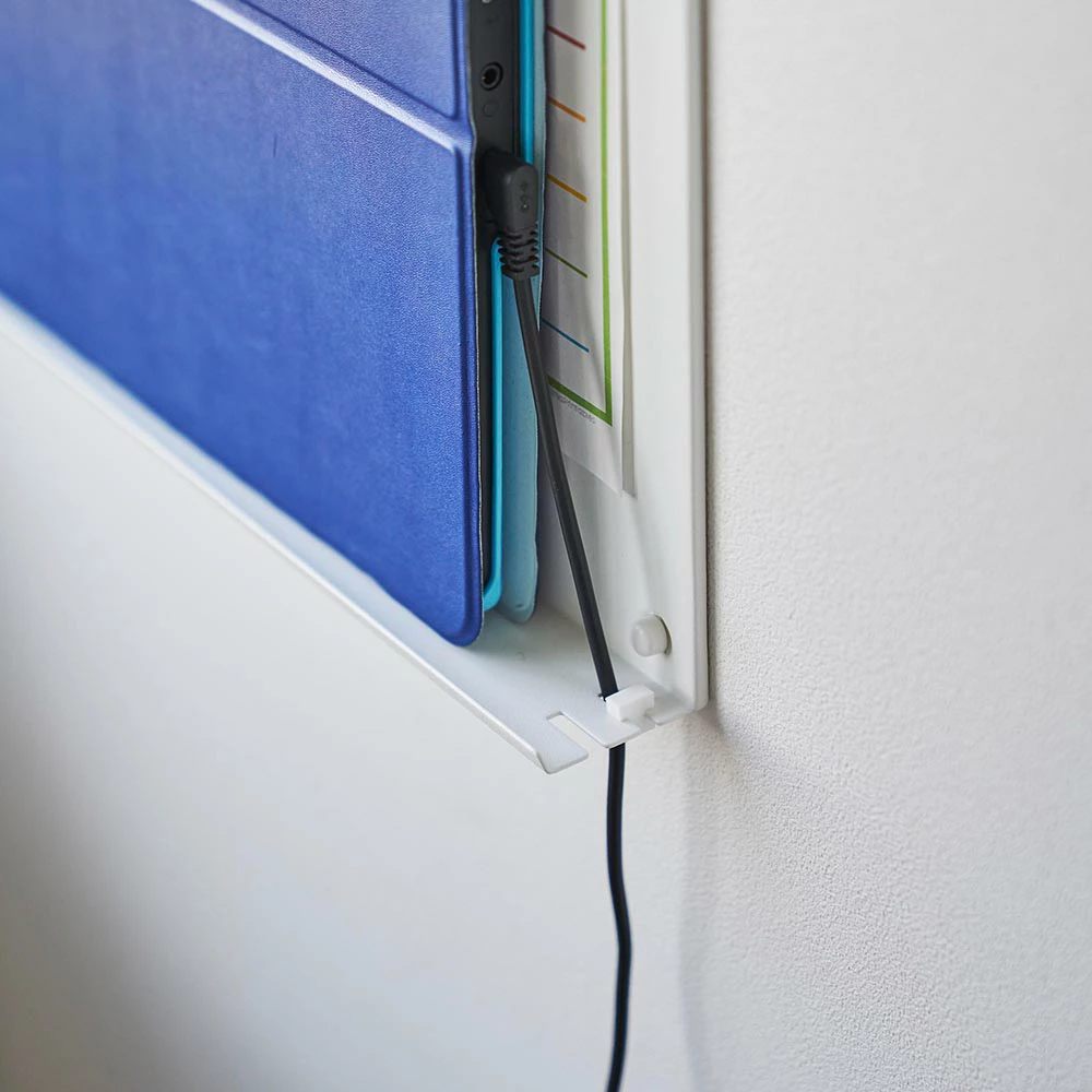 【ウォールプリントボード トレー付き 石こうボード壁対応】お子様の学習用プリントやタブレットの収納にも便利なトレー付きプリントボード。ボード下のトレーにはペンや充電中のタブレットも置けて便利◎付属のストッパーで、ホルダーに引っ掛けた充電ケーブルの落下を防止できます。マグネット付きなのでお便りやクーポンを貼り付けられ、紛失する心配もなし!