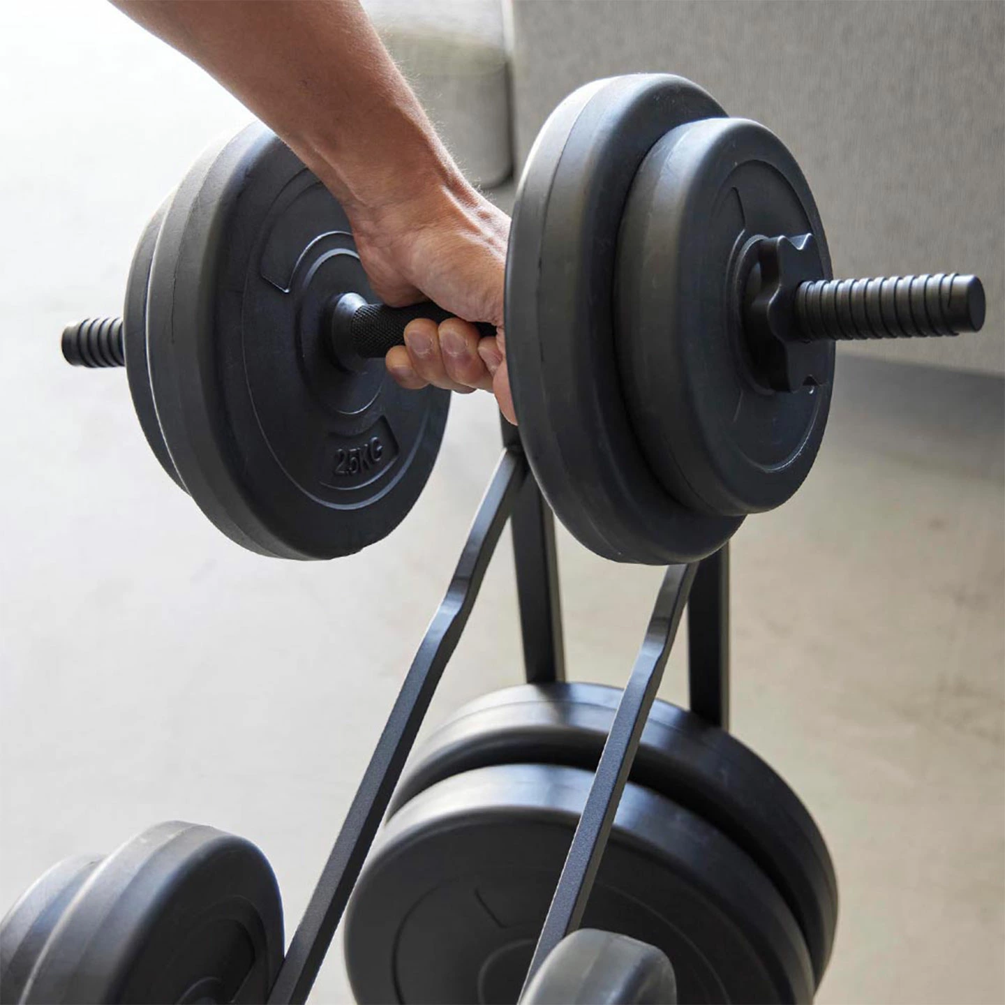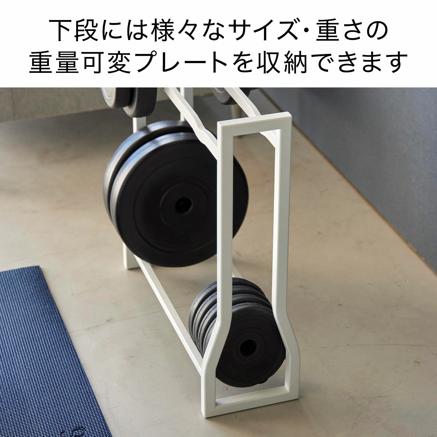 【ダンベルラック】置き場所に困るダンベルセットをまとめて収納できるラック。重量可変プレート、腹筋ローラーやフォームローラーなどのフィットネスグッズも一括収納できて便利。上段にはくぼみがあるのでダンベルが転がらない設計です。下段には様々なサイズの重量可変プレートを収納できます。