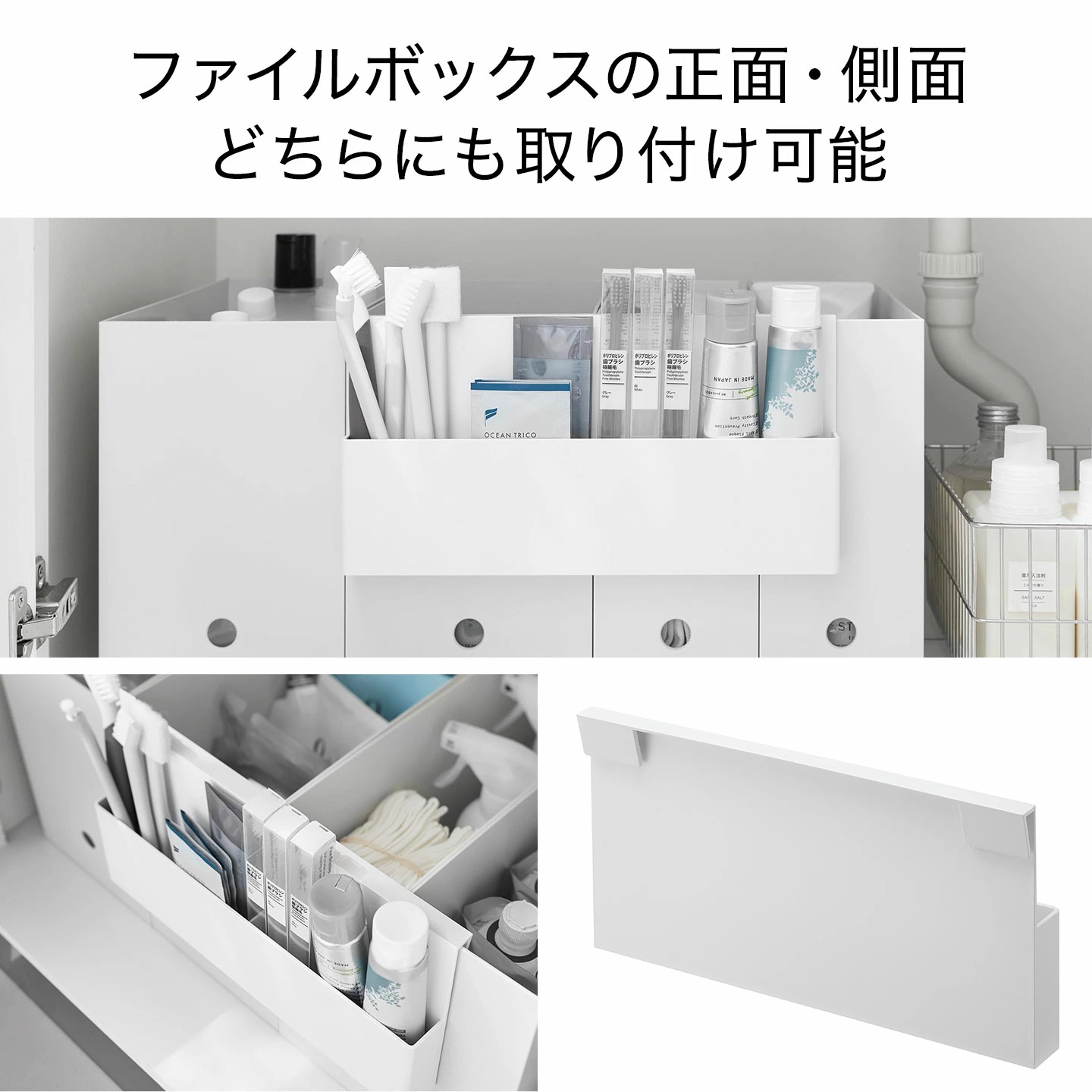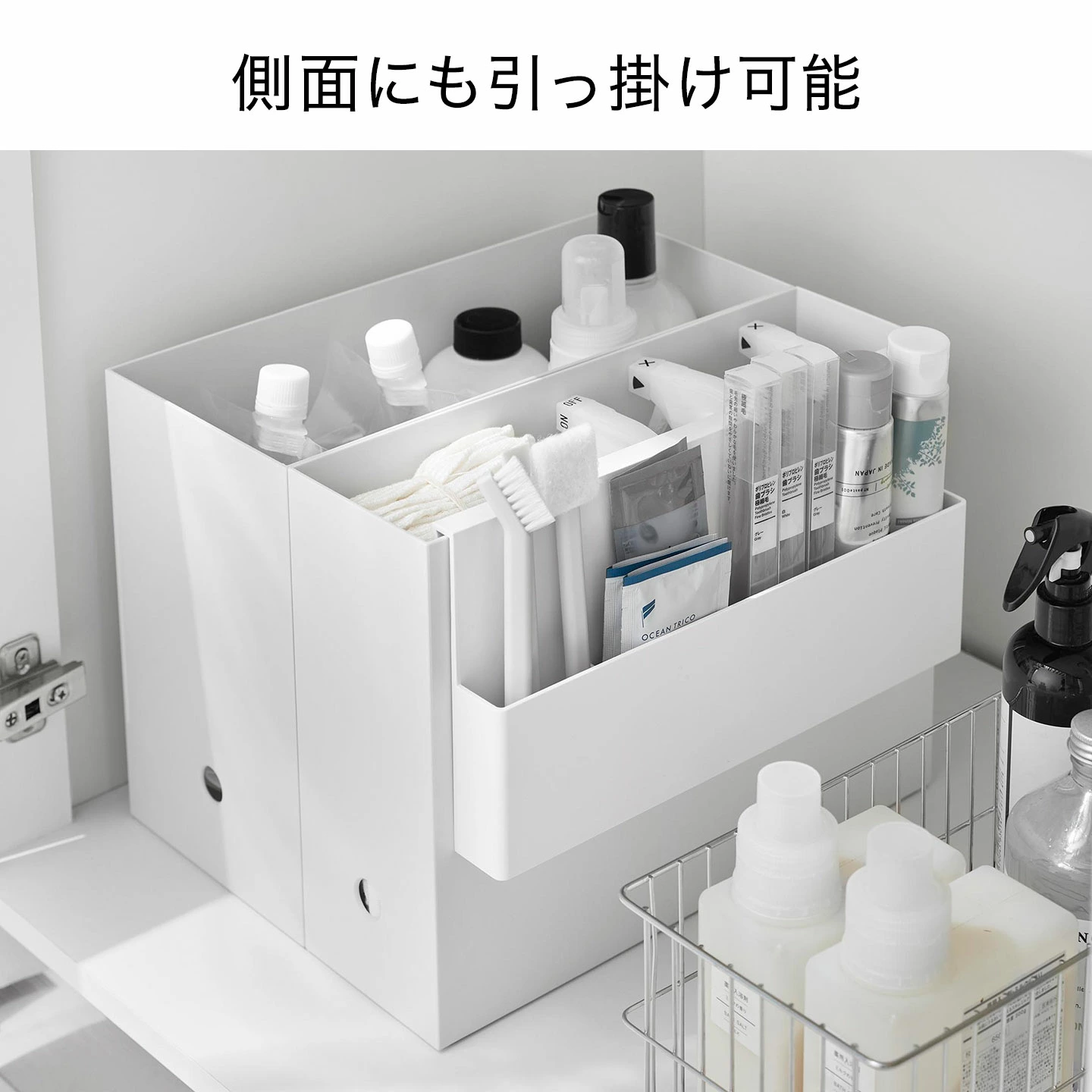 【引っ掛け収納ホルダー】ファイルボックスやワゴンに引っ掛けて使える収納ホルダーです。洗面周りの小物整理に便利で、歯ブラシや歯磨き粉のストック、小さなお掃除ブラシなどの収納に便利です。フックは複数個並べたファイルボックスにも対応する形状で、正面・側面どちらにも取り付け可能。ワゴンに引っ掛けて、ステーショナリーなど細々した物の収納にも役立ちます。
