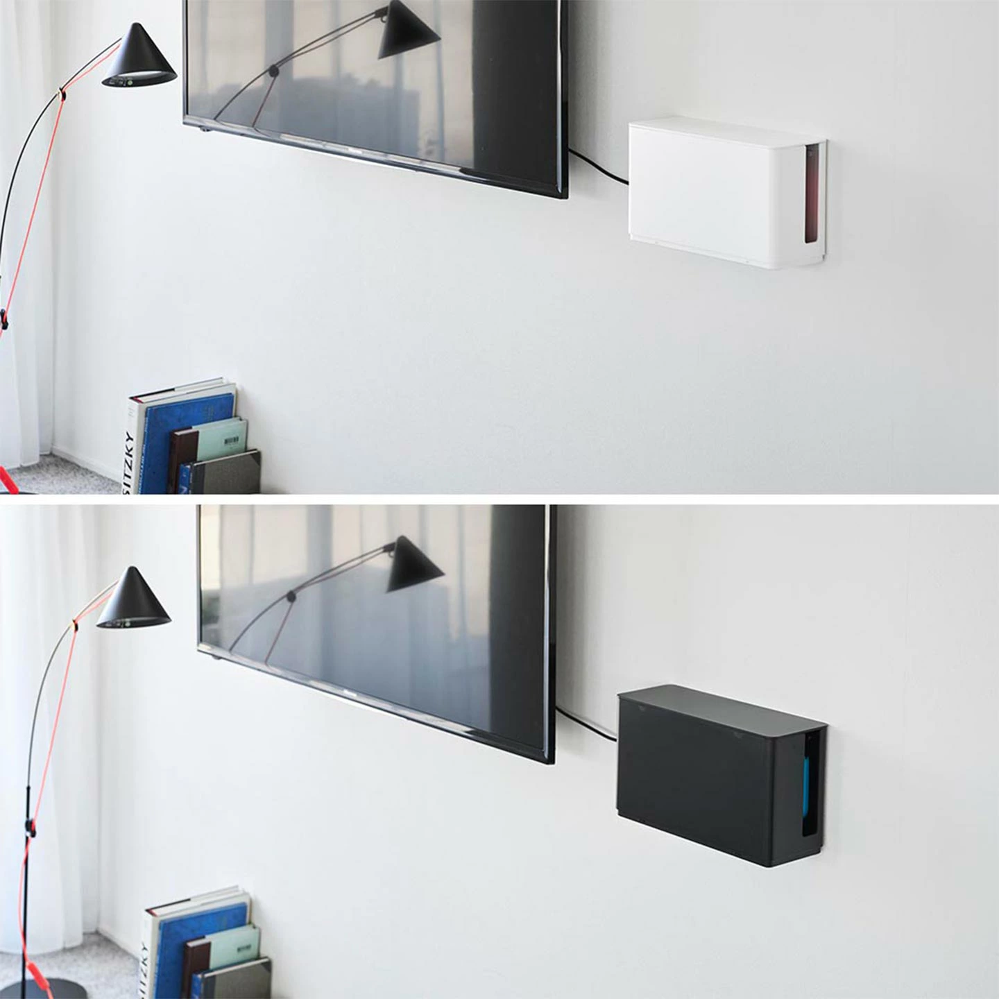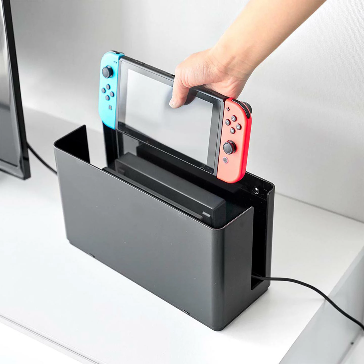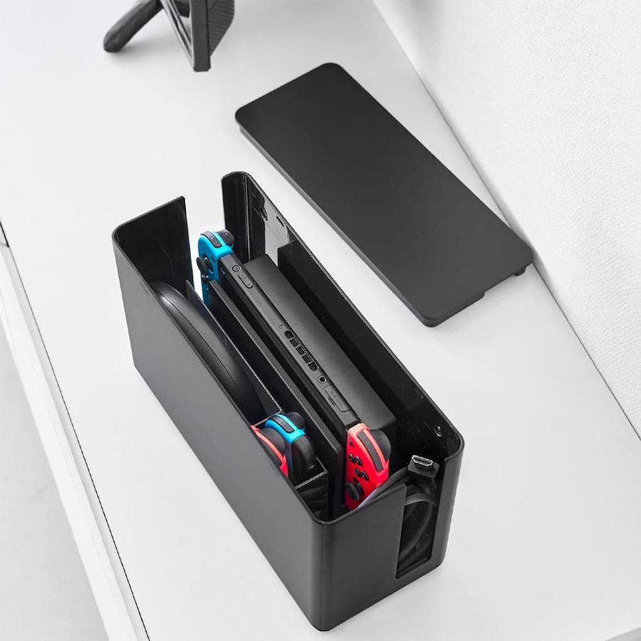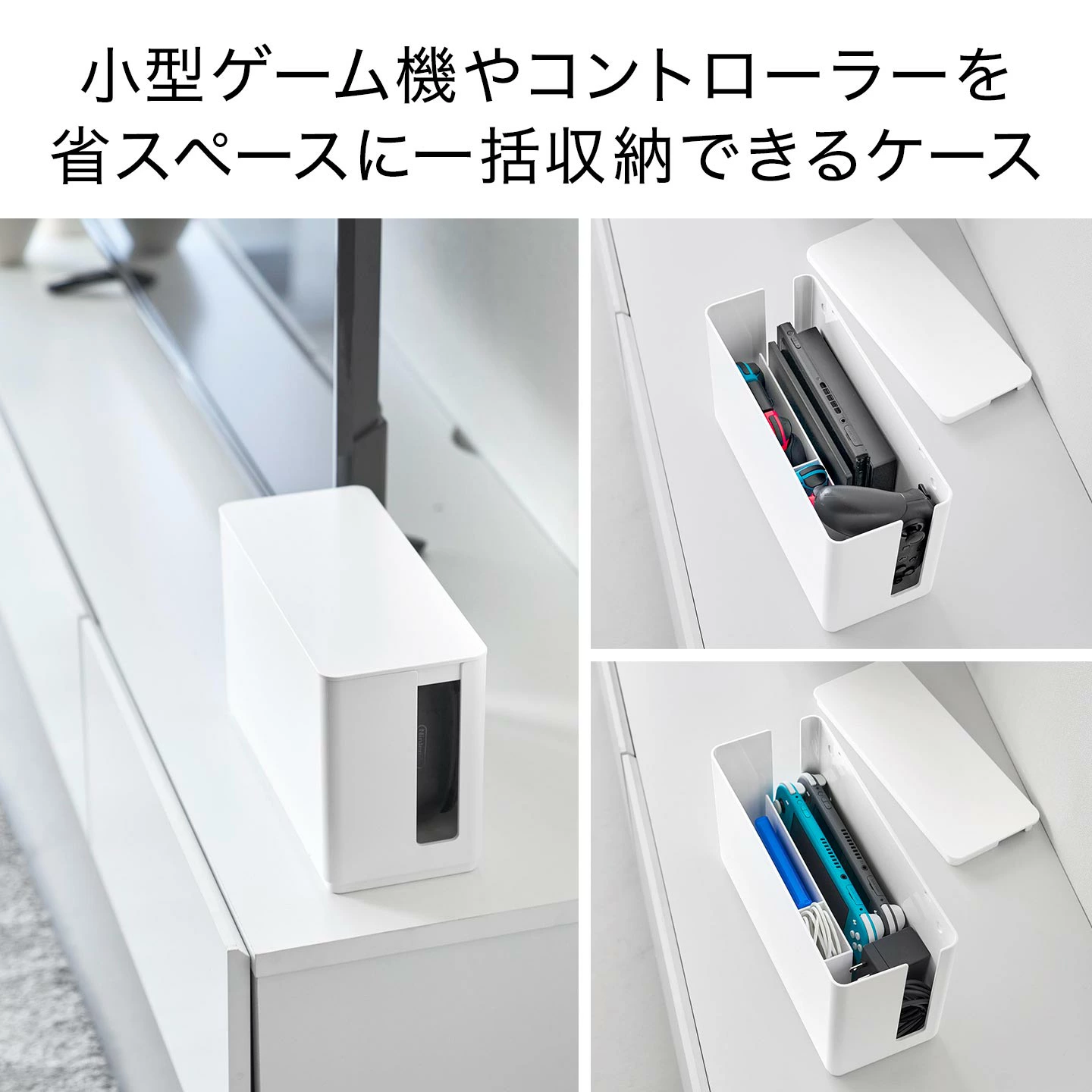 【蓋付き重ねられるゲーム機器収納ケース】ゲーム機やコントローラーなどを省スペースに一括収納できる、蓋付き重ねられる収納ケースです。置き場所に困る小型ゲーム機を充電しながら収納可能!仕切り付きなのでゲーム機本体やコントローラー、周辺機器を整理しやすく便利です。壁の穴が目立ちにくい石こうボードピンで簡単に壁へ取り付けでき、浮かせて収納できるので掃除もラクラク。蓋付きなのでほこりも防げます。蓋を外せば2個までスタッキング可能で、省スペースにすっきり収納できます。