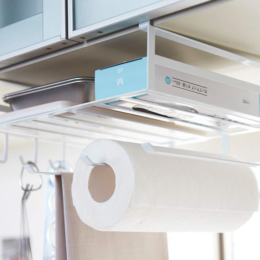 吊り戸棚の下を有効活用キッチン小物をたっぷり収納よく使うキッチンペーパー、布巾、調理道具、ラップ類など一括収納お弁当箱・タッパー・キャニスター・スパイス・パスタなどのストック収納にも使える頻繁に使うフライパン(直径28cmまで)も入るまな板・布巾・ラップ類・フライパン・鍋ふた・レシピ本など収納可能キッチンツールを掛けておくのに便利なフックが5個ラック下の隙間を利用してポリ袋やティッシュ箱からそのまま取り出せる布巾やタオルを掛けられるハンガーが3本