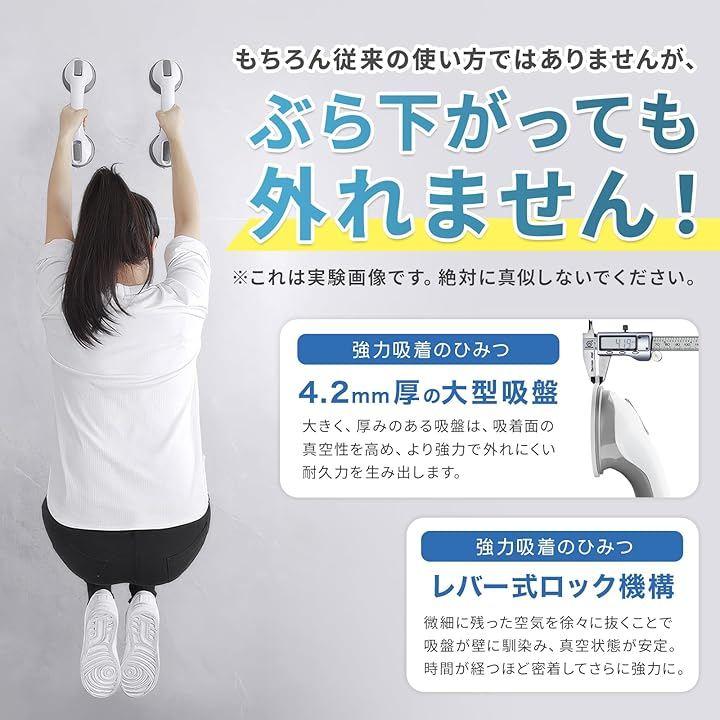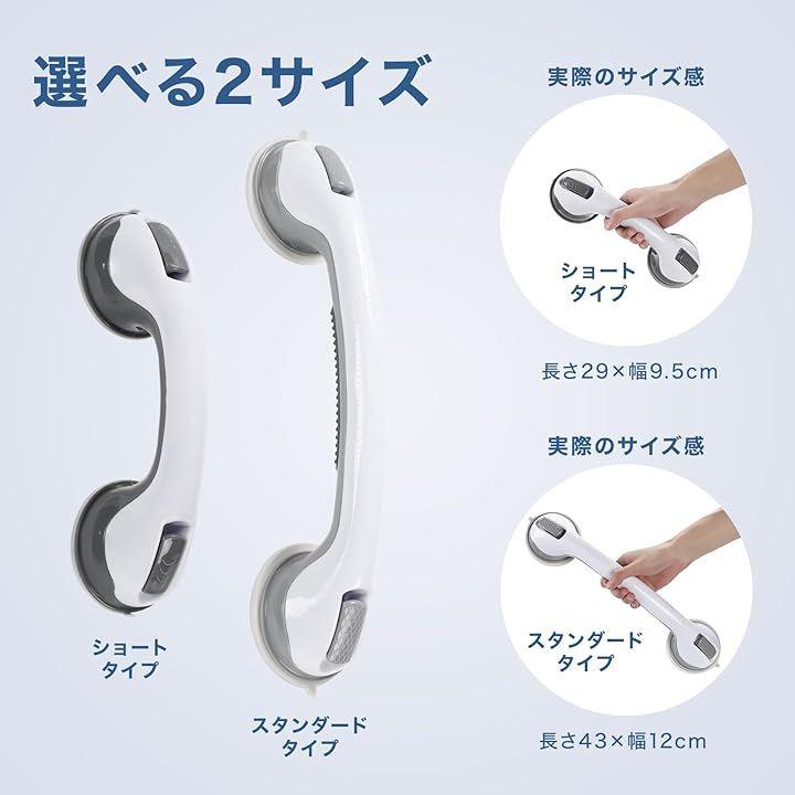 「商品詳細」 ・素材:ABS樹脂 ・カラー:ホワイトxグレー ・設置場所:玄関、階段、トイレ、バスルーム、室内各所 ・特徴:吸盤強力、穴あけ不要、取り付け簡単 ・用途:介護用手すり、ドアハンドル、入浴介助、転倒予防