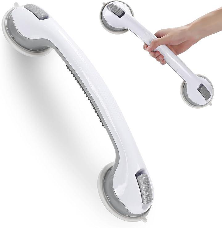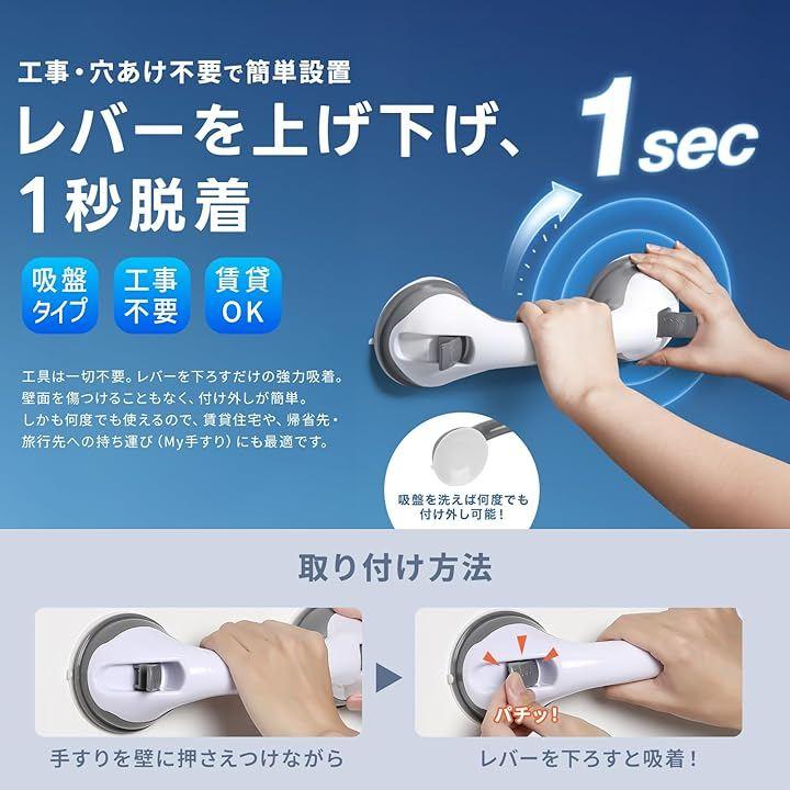 「商品詳細」 ・素材:ABS樹脂 ・カラー:ホワイトxグレー ・設置場所:玄関、階段、トイレ、バスルーム、室内各所 ・特徴:吸盤強力、穴あけ不要、取り付け簡単 ・用途:介護用手すり、ドアハンドル、入浴介助、転倒予防