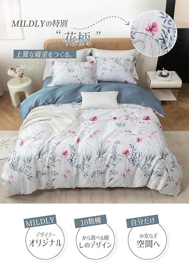 「デザイン性で変わる寝室空間」 MILDLYデザイナーチーム開発のオリジナル花柄が、寝室をベッドカバー おしゃれな空間に進化させます。