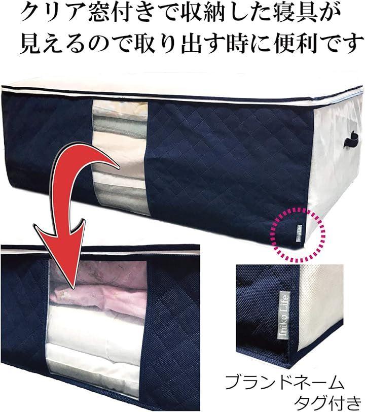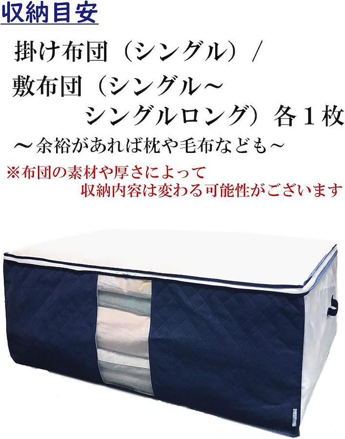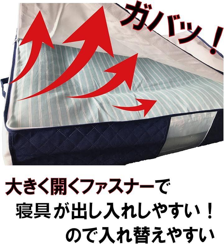 *持ち手部分にかなり重さがかかりますので取り扱いにご注意ください(持ち手部分は二重縫製加工済)/通気性を重視し厚紙などは入っておりませんので、収納物が入っていない場合は自立しません(使用しない時はコンパクトに畳めます)/収納する寝具の厚みなどにより収納目安は変わります。