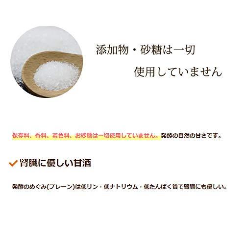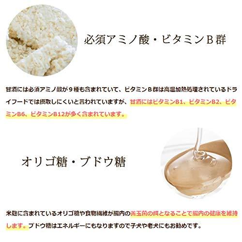 ドライフードにかけていただいたり ドライフードだけでは高温加熱により栄養が失われるビタミンB群や乳酸菌をかけることにより簡単に摂取することができます。食いつきの悪い子や腸内の健康維持にお勧めです生肉や手作り食にかけたり調味料にプラス 消化にも優しいので手作り食やおやつ、甘みがあるので調味料としてプラスすることにより旨味がアップし、食いつきが良くなります。お水やヤギミルクに混ぜて 飲み水やヤギミルクに混ぜてあげることにより、食いつきがよくなります。夏は冷やして、冬は暖めてあげる事も。低脂肪で栄養豊富な米麹甘酒。なるべく体に負担をかけずに栄養補給させてあげたい時におすすめ。 消化に優れるだけでなく、オリゴ糖や乳酸菌など、腸内良性菌のエサとなる事で腸内環境の健康維持となるお腹にも優しい成分も豊富です。腎臓と膵臓に優しい甘酒。発酵のめぐみ(プレーン)は低リン・低カリウムで低脂肪。腎臓と膵臓にやさしい甘酒となっております。 ※エネルギーとなる糖質が豊富なため、糖尿病がある場合はご注意ください。