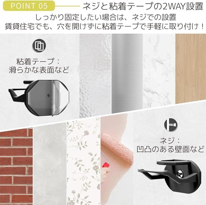 「2WAY設置で壁に穴を開けずに設置も可能」この帽子掛けは、ネジと粘着テープの2通りの設置方法で、様々な壁に対応。