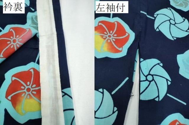 状態は接写画像のように衿裏に薄い汚れ、左袖付に糸解けがございますが