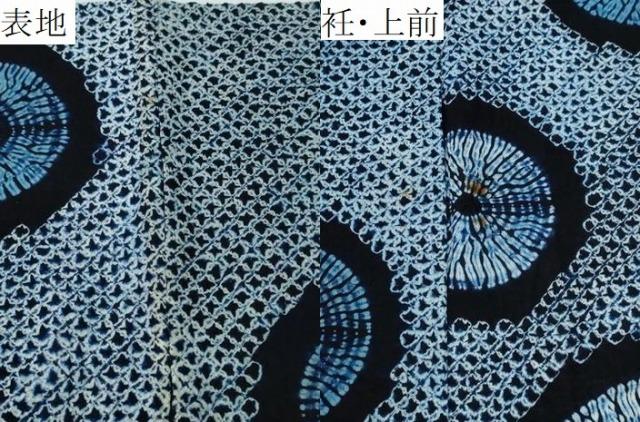 状態は接写画像のように表地にヤケ、衽・上前にシミがございますが
