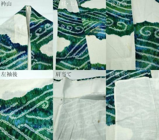 衿山・衽・上前・後身頃・左袖後・肩当てに薄い汚れ、居敷当てに糸解けがございますが