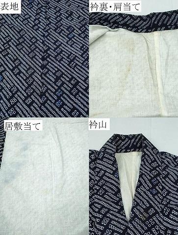 表地所々・肩当て・居敷当てにシミ、衿山に汚れがございます。