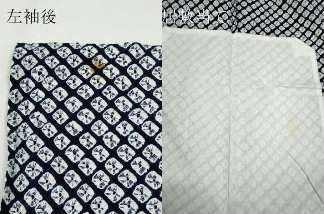 状態は接写画像のように左袖後・居敷当てに薄いシミがございますが