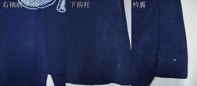 状態は接写画像のように右袖前にヤケ、下前衽に薄い汚れ、衿裏に破れ穴がございますが