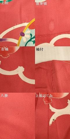 着物【正絹・一つ紋】の状態は接写画像のように上前・上前おくみ・右袖・袖付・八掛に汚れ、後身頃にシミがございますが