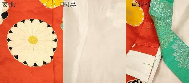 着物【正絹】の状態は接写画像のように表地所々・胴裏所々に薄い汚れ、重ね衿に糸解けがございます。