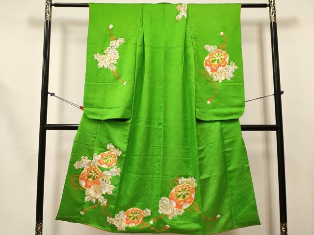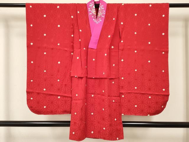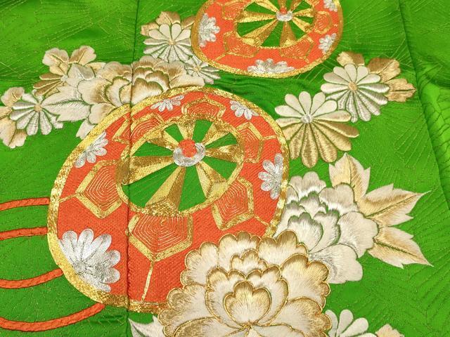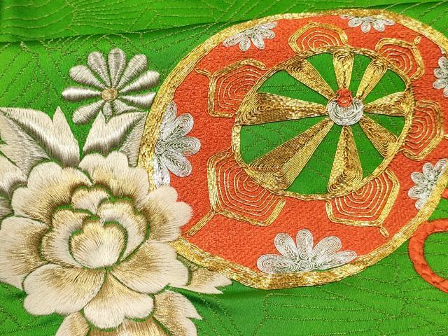 平和屋着物∵女の子 十三参り 子供 祝着・長襦袢(無双仕立て)セット 駒刺繍 総刺繍 源氏車花文 金銀糸 金通し地 逸品 DABC5159ma