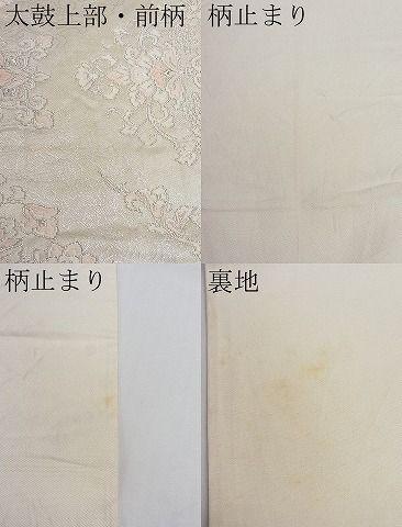 状態は接写画像のように太鼓上部・上前・柄止まり・裏地に薄い汚れがございますが