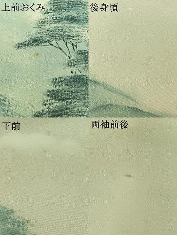 状態は接写画像のように上前おくみ・後身頃・下前・両袖前後に汚れがございますが