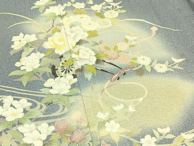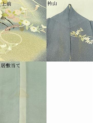 状態は接写画像のように上前・衿山・居敷当てに薄い汚れがございますが