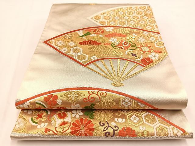 平和屋着物◎西陣 六通柄袋帯 唐織 扇面宝尽くし花文 金銀糸 証紙付き 正絹 逸品 未使用 BAAV7701yc