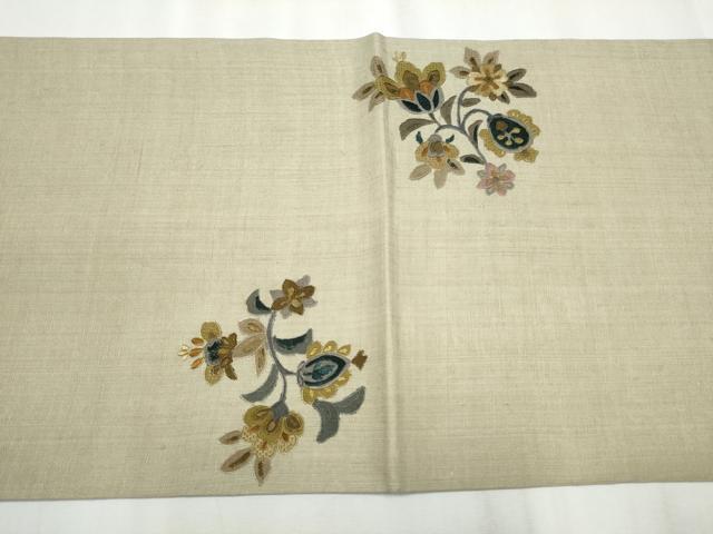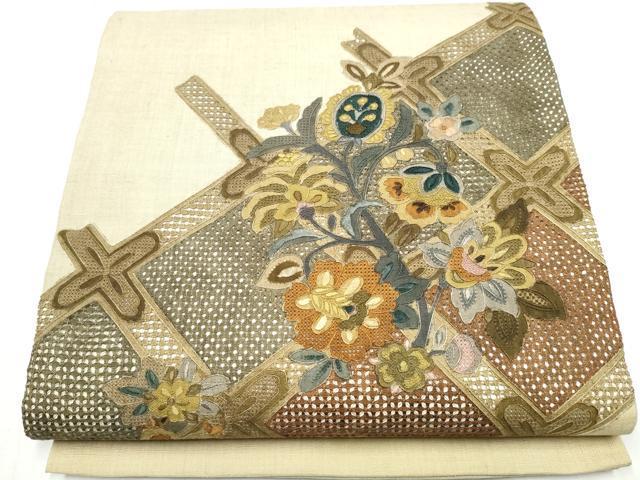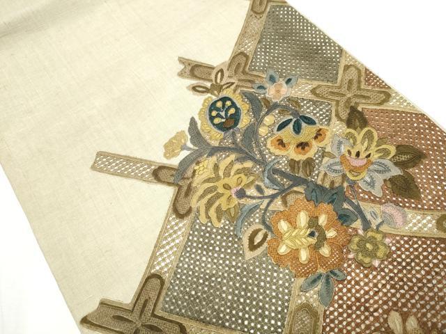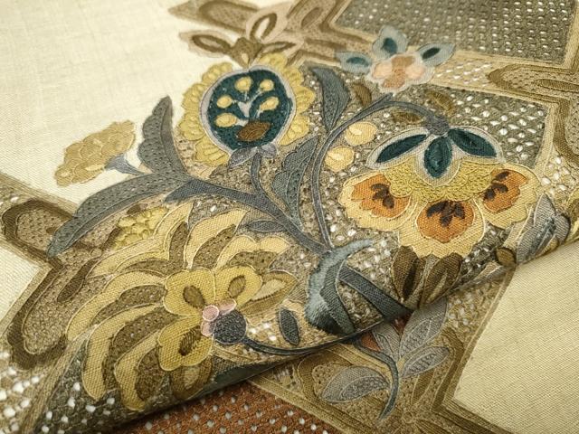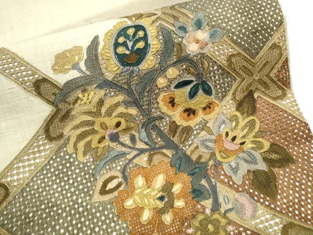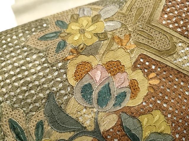 平和屋着物●中国三大刺繍 スワトウ相良刺繍 総刺繍 太鼓柄袋帯 紬地 更紗花文 正絹 逸品 CABB5716hy