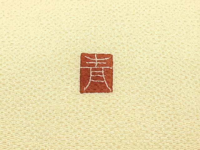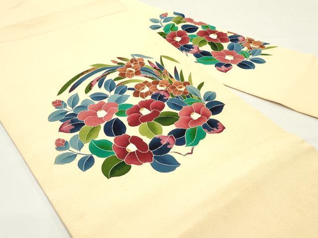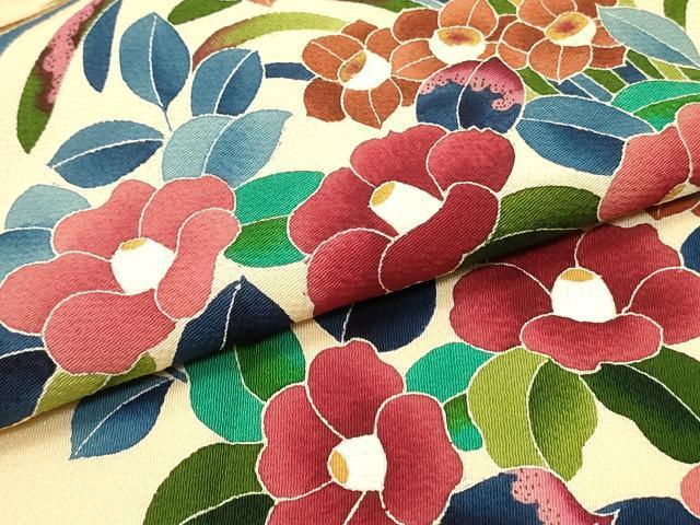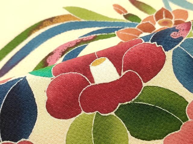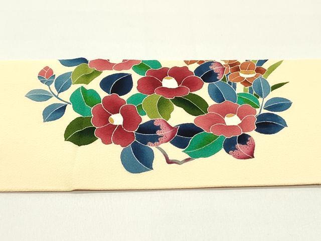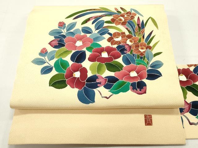 平和屋着物●九寸名古屋帯 友禅 作家物 椿文 鬼しぼ縮緬 正絹 逸品 DAAZ3205ob