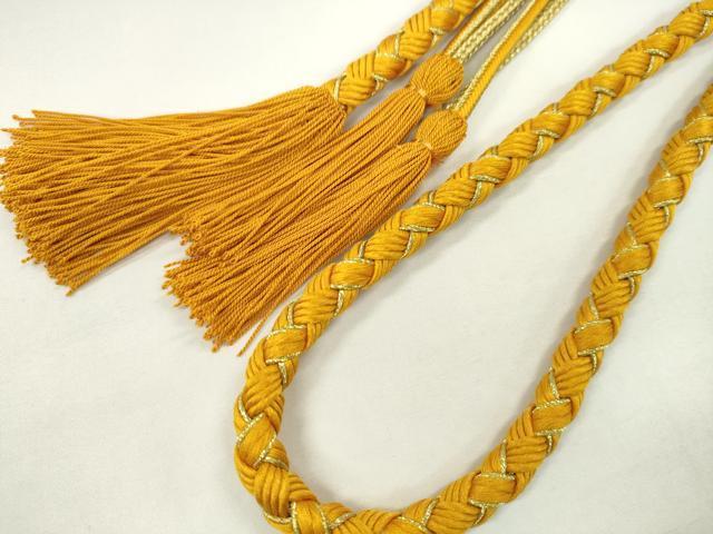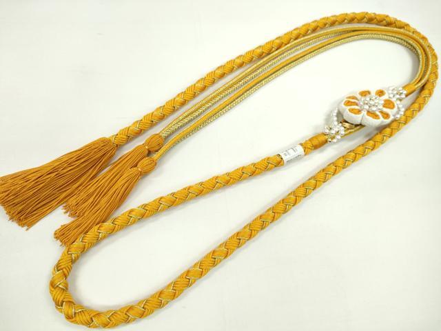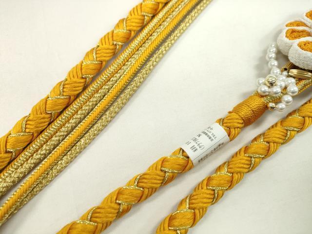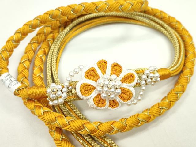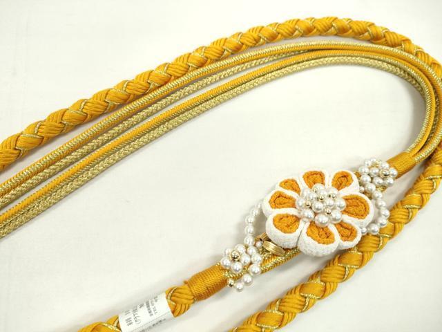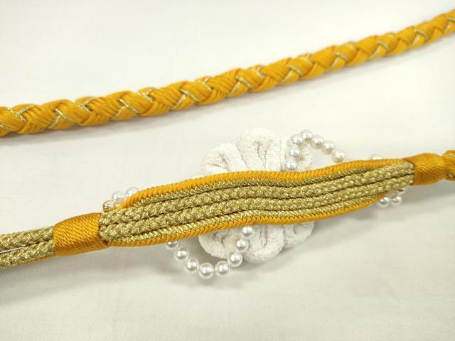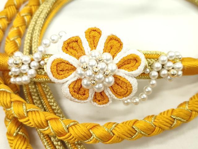 平和屋着物●和装小物 振袖用帯締め 飾り付き つまみ細工 パール 花 山吹色 金糸 撚り房 逸品 未使用 CAAX8336ju