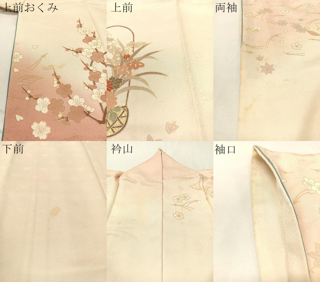 状態は接写画像のように上前おくみ・上前・両袖・下前・衿山・袖口に薄い汚れがございます。