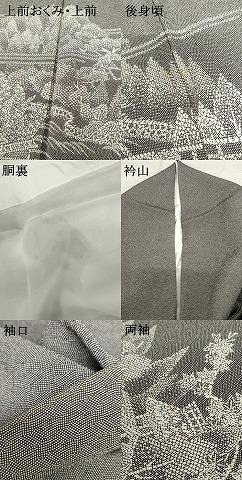 状態は接写画像のように上前・上前おくみ・袖口・両袖に汚れ、胴裏にシミ、衿山に薄い汚れがございますが