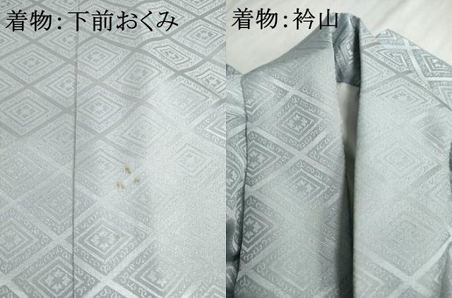 着物の状態は接写画像のように下前おくみにシミ、衿山に汚れがございますが