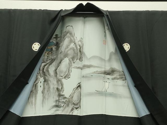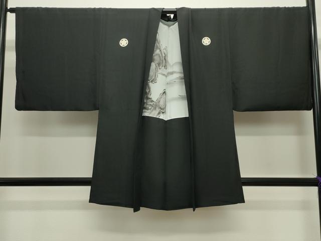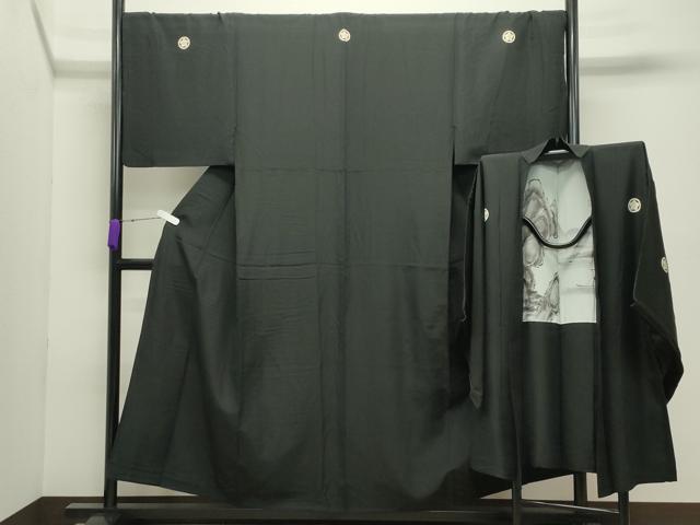 平和屋着物●男性 黒紋付 羽織セット 羽裏:風景文 キングサイズ 正絹 逸品 CABC8288gh