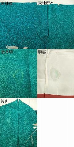 状態は接写画像のように左袖後・衿山に薄い汚れ、表地所々にヤケ、後身頃・胴裏にシミがございます。