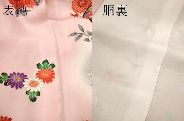 産着【表地:正絹・胴裏:化繊】の状態は接写画像のように表地所々・胴裏に薄い汚れがございます。