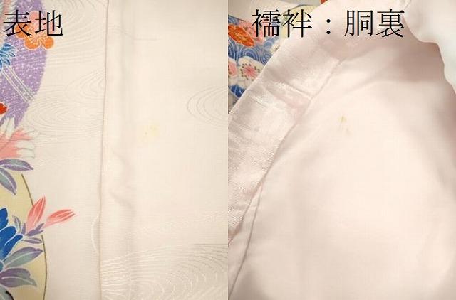 産着【表地:正絹・胴裏:化繊、襦袢:化繊】の状態は接写画像のように表地所々・襦袢の胴裏に薄い汚れがございます。