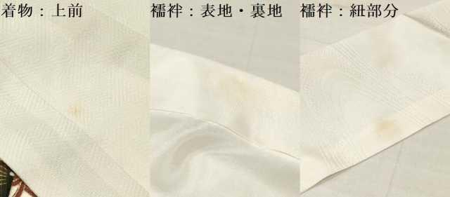 接写画像のように上前・襦袢表地・裏地・紐部分に薄い汚れがございますが