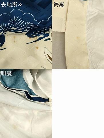 産着【正絹・五つ紋】の状態は接写画像のように表地所々・衿裏・胴裏に汚れ、胴裏に糸解けがございます。