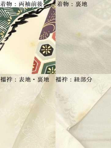 状態は接写画像のように着物:両袖前後・裏地に薄い汚れ、