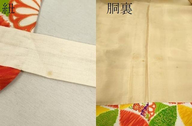 着物【正絹】の状態は接写画像のように紐に薄い汚れ、胴裏に経年によるアクがございますが