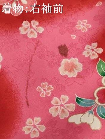 着物【化繊】の状態は接写画像のように右袖前に汚れがございますが