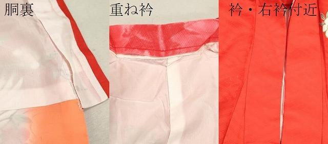 の状態は接写画像のように胴裏に糸解け、重ね衿・胴裏に薄い汚れ、衿・右衿付近に穴がございますが