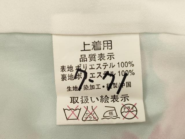 着物【化繊】の状態は接写画像のように右袖前に汚れ、重ね衿にシール跡、八掛に擦り切れがございますが