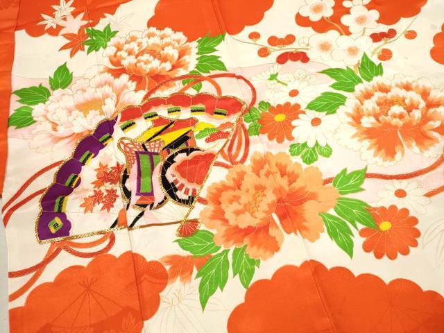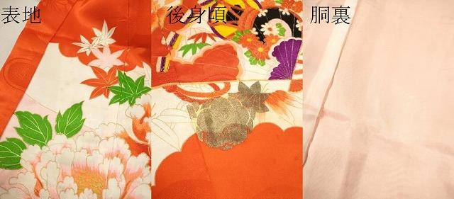 着物【化繊】の状態は接写画像のように表地所々・胴裏に薄い汚れ、後身頃に金彩の劣化がございます。