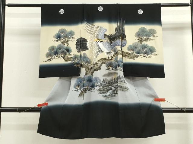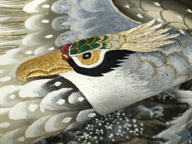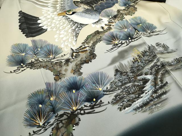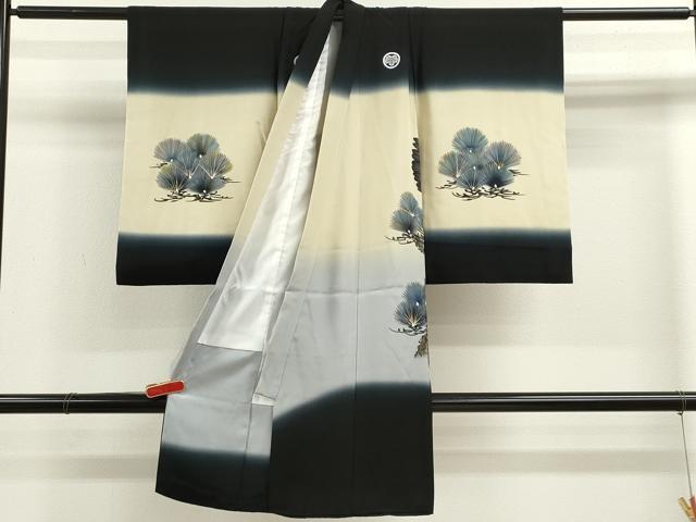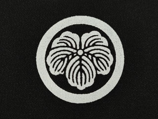 着物【表地:正絹・胴裏:化繊・五つ紋】の状態は接写画像のように両袖後ろに薄い汚れがございますが