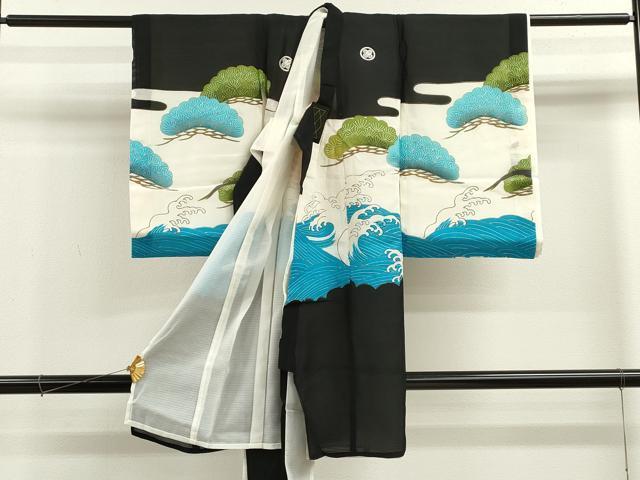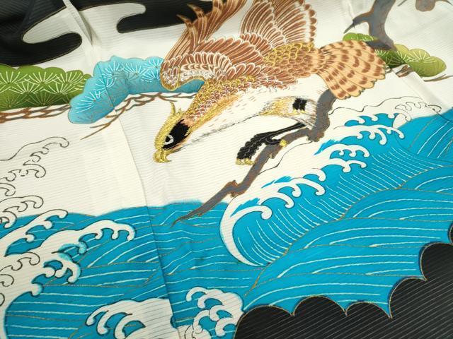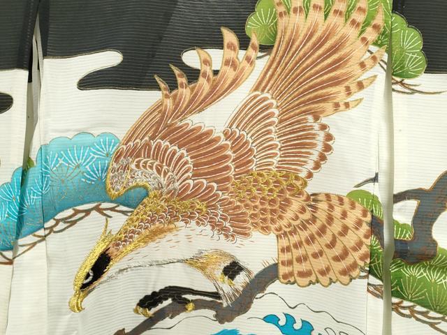産着【祝着:正絹、襦袢:化繊・五つ紋】の状態は接写画像のように右袖・紐に薄い汚れがございますが