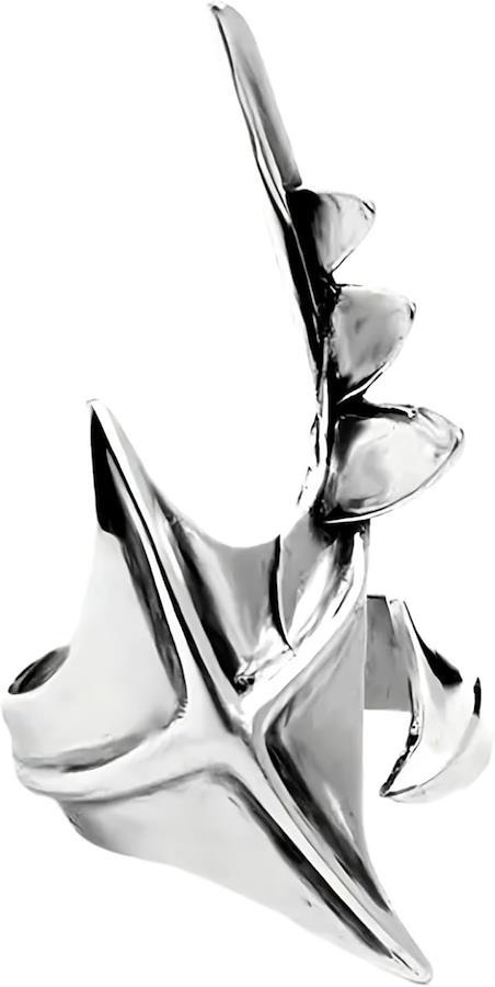 このリングは、鋭いエッジと幾何学的なフォルムを追求した、クールで洗練されたデザインが特徴です。