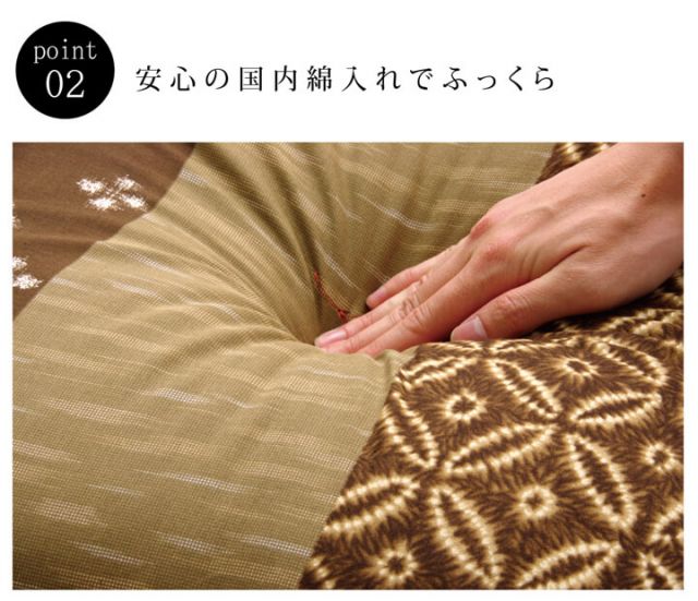 綿100%和柄の座布団です。綿は繊維の中でも特に肌触りがよく、季節を選ばずオールシーズンご使用頂けます。和風の雰囲気のある柄なので家のリビングだけでなく、お店(居酒屋、和風の飲食店など)にもおススメです。国内でわた入れ加工を行っております。ふっくら柔らかな座り心地です。※本商品の側地部分の取り外しはできません。