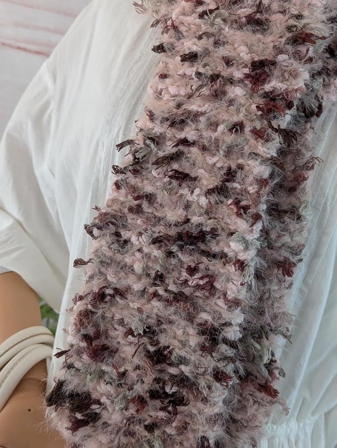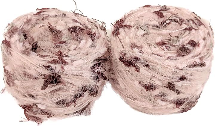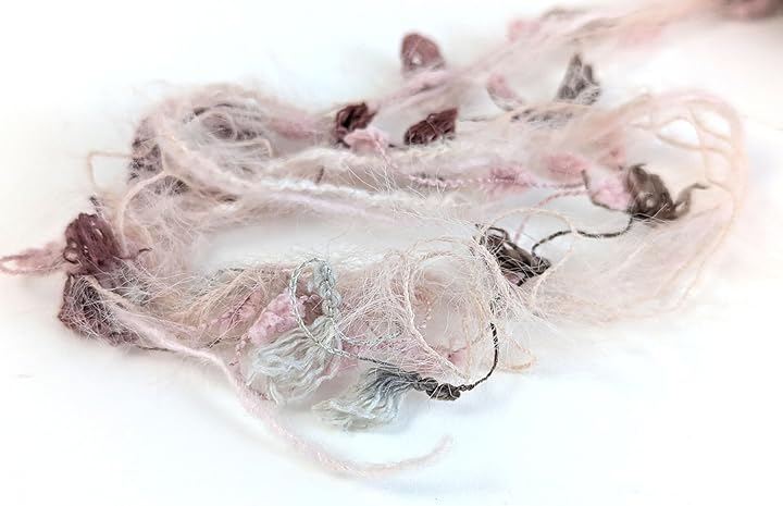 ふわふわのモヘア毛糸をメインに、リボンが付いた糸、ループ状の糸など、様々な糸を組み合わせた引き揃え糸。