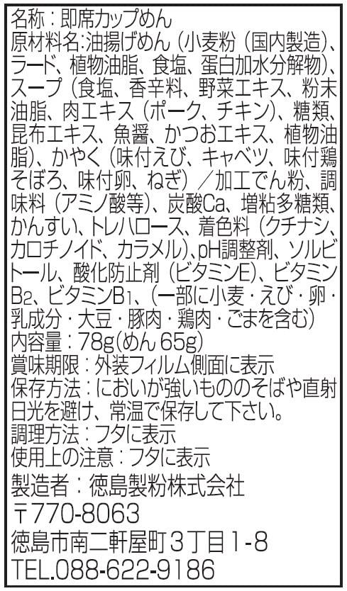 原材料:油揚げめん(小麦粉(国内製造)、ラード、植物油脂、食塩、蛋白加水分解物)、スープ(食塩、香辛料、野菜エキス、粉末油脂、肉エキス(ポーク、チキン)、糖類、昆布エキス、魚醤、かつおエキス、植物油脂)、かやく(味付えび、キャベツ、味付鶏そぼろ、味付卵、ねぎ)/加工でん粉、調味料(アミノ酸等)、炭酸Ca、増粘多糖類、かんすい、トレハロース、着色料(クチナシ、カロチノイド、カラメル)、pH調整剤、ソルビトール、酸化防止剤(ビタミンE)、ビタミンB2、ビタミンB1、(一部に小麦・えび・卵・乳成分・大豆・豚肉・鶏肉・ごまを含む)