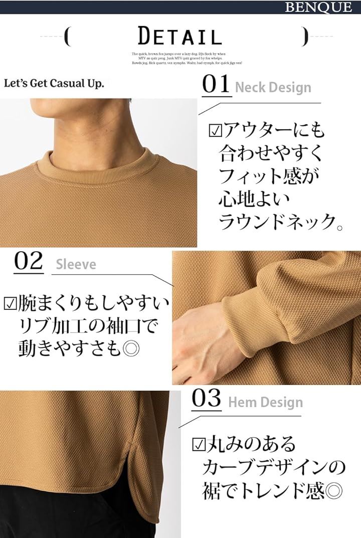 心地よいフィット感のラウンドネックのため、様々なアウターにも合わせやすいのもポイントです。